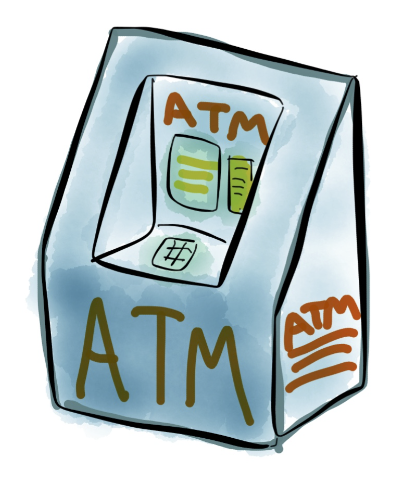 An ATM (“Automated Teller Machine”) resembles a slot machine in many respects: the user fiddles with a set of controls for a bit, and money (hopefully) comes out in the end.