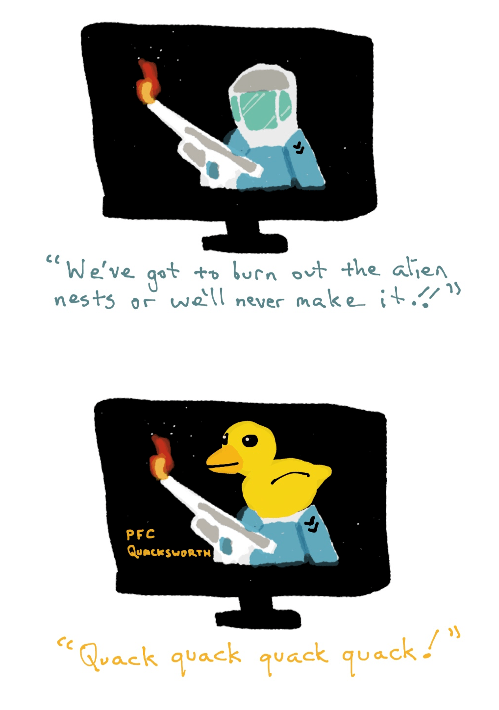 Fig. 1: Now that everyone’s head is a rubber duck, this space marine game takes on a different character.