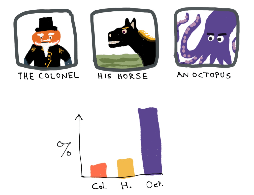 Fig. 2: Here is a feature that can be added to any game where the player accumulates money: one of the characters above steals money from the player, but there is evidence implicating all three characters, so it’s difficult to determine the actual perpetrator. The culprit is randomly chosen for each player, and is equally likely to be the colonel, the horse or an octopus. However, players are FIVE TIMES more likely to accuse the octopus, as seen in this fabricated figure!