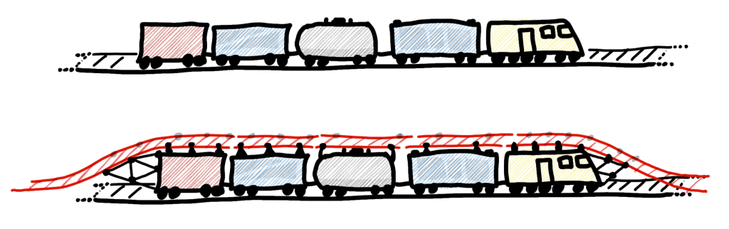 There is one incredibly simple solution to this problem: just put an additional set of tracks on top of every train car (Figure 1).