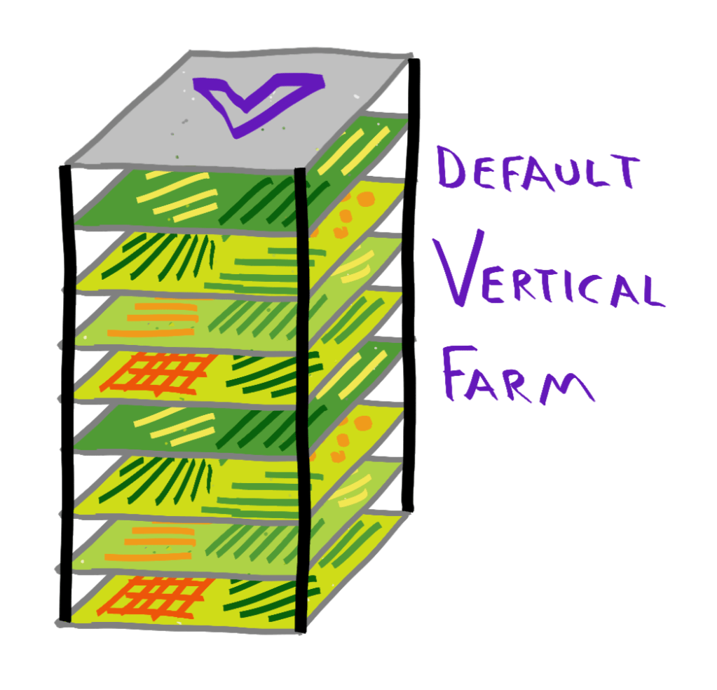 Although there are many conceptual advantages to such a farm, there is at least one major difficulty: light. Obviously, only the topmost layer of a vertical farm would be practical to light with sunlight (Figure 1): lower layers would need to be lit with high-efficiency narrow-spectral-band LED lighting.