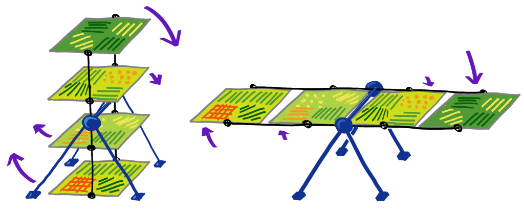 Fig. 2: Each floor on this vertical farm is mounted on an enormous central pivot point. The building can be slowly turned from a vertical to a horizontal orientation. Now the plants can directly use the sun, cutting out the LED lighting middle-man!