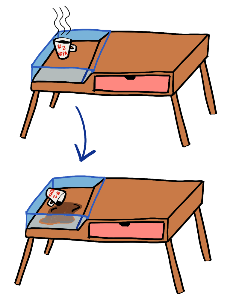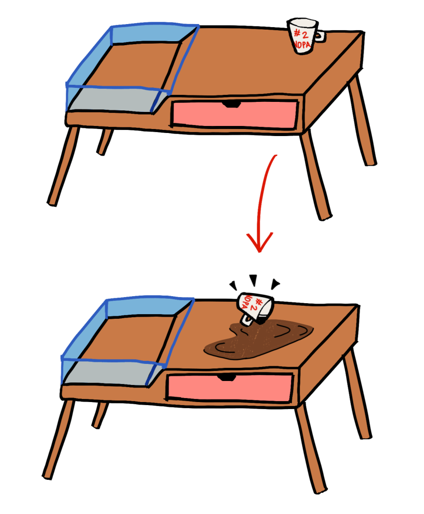 People often place a drink on their desk. However, this makes it very easy to accidentally knock the drink over onto (depending on the era) a stack of rolled-up papyrus scrolls, a Gutenberg Bible, or a laptop (Figure 1).