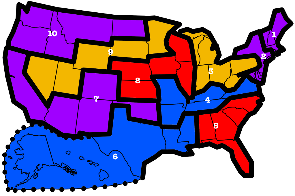 Here, we propose that the United States be grouped—for the purposes of elections only—into 10 five-state “electoral mega-regions.” Washington D.C. will retain its 3 electoral votes, and will be counted as a secret “Megaregion Zero” (not shown on map).