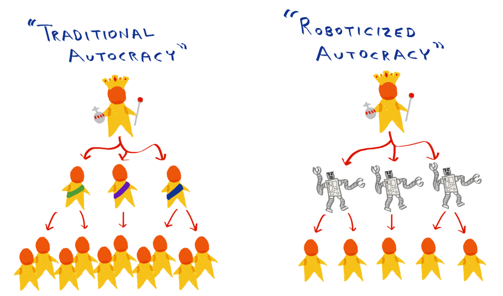 Fig. 1: Conceptually, the left and right sides of this figure depict the same government organization. But with the “roboticized” version on the right, the ruler can rely on 100% loyal (and totally amoral) robots instead of human subordinates.
