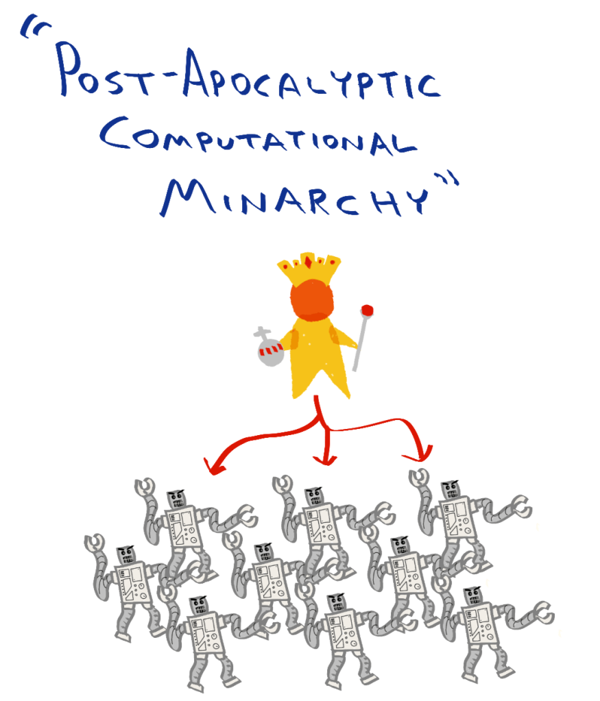 GOVERNMENT TYPE 4: 🤴🤖🤖 (“computational minarchy”: human leader, robot lieutenants, robot workers)