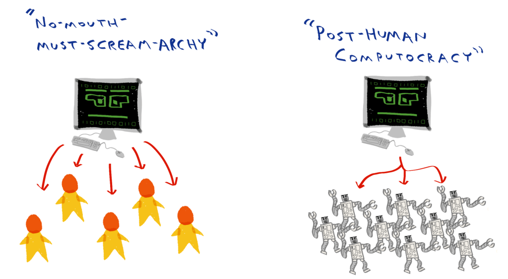 Fig. 2: The only difference between the situations here is that the top-level decision-maker on the left is a computer. However, humans could at least theoretically still override the computer’s decisions, since it doesn’t actually exercise power except by issuing commands to its (human) subordinates.