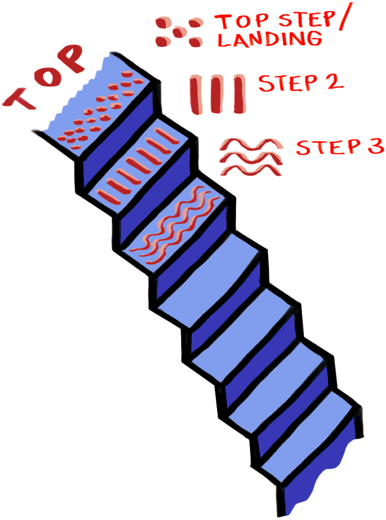 Fig. 2: Possible step patterns: the top step is marked with a raised “⠿” pattern, the second next step with “𑁔”, and the third step with a “≈” . Now a person will intuitively “feel” when they are nearing the end of a staircase.