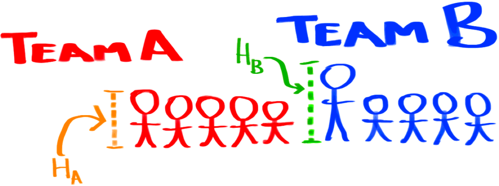 Here, we propose to adjust the heights of each team’s target goal so that the taller team must also attempt to score at the taller goal. In Figure 1, we see an example of two teams with players of varying heights.