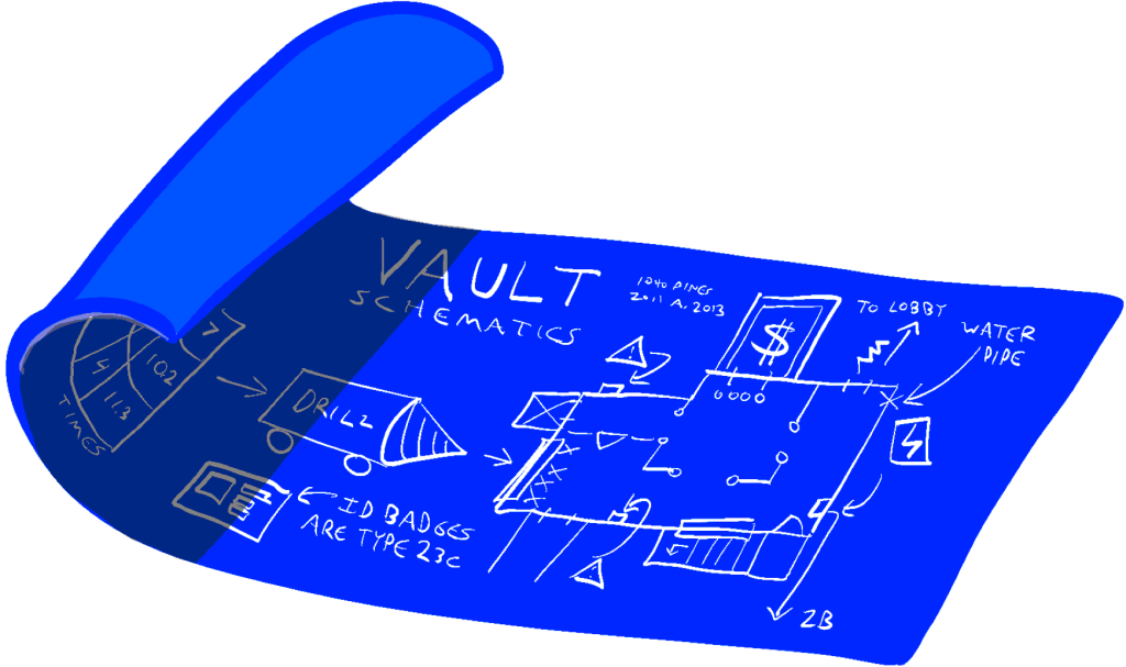 - The interviewer unrolls a “heist planning” blueprint (and/or a corkboard with lots of red string on it) and asks the interviewer what their proposed role would be in the heist depicted in the blueprint (Figure 1).