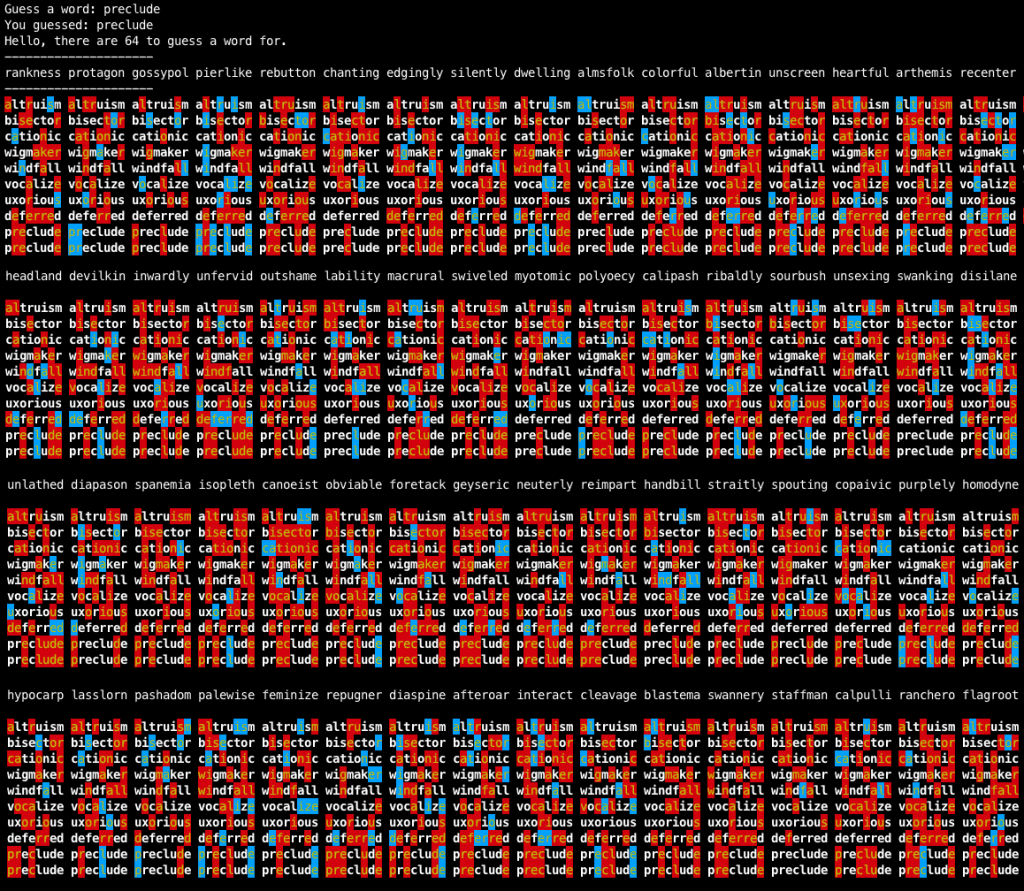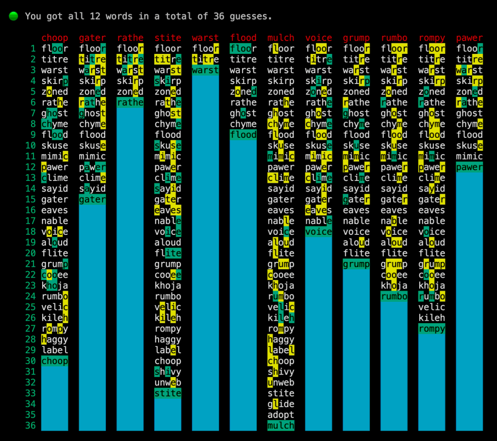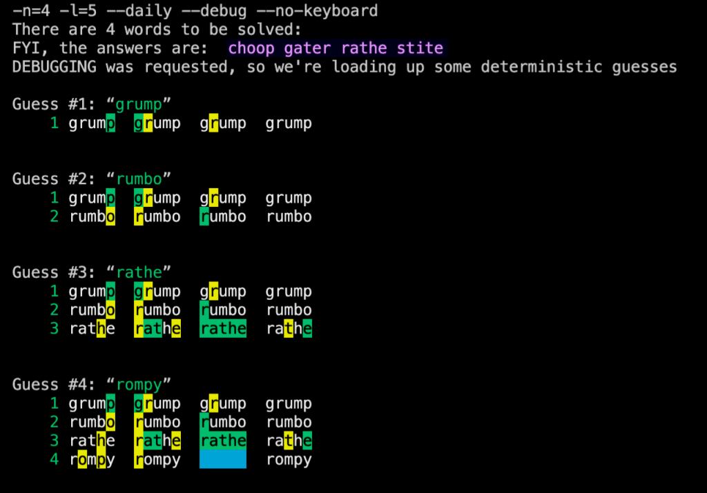 One important new feature is that we can also specify, say, “–letters=12” to guess twelve-letter words (Figure 3) instead of five-letter words.