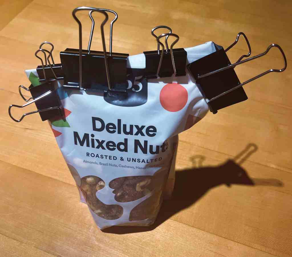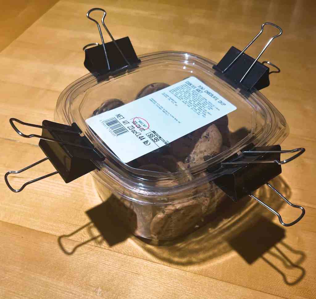 Behold, the solution! Just put an excessive number of binder clips on the container that you’re trying to protect* (Fig. 1), and you’ll find that your desire to chomp on thousands of calories of chocolate chip cookies is kept in check by your similar desire to not have to undo (and redo) a bunch of binder clips.