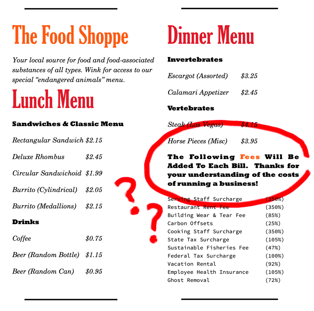 But sometimes this is not true. Airlines, cell phone providers, and restaurants (among other businesses) occasionally add non-obvious “bonus” costs to the final fee.