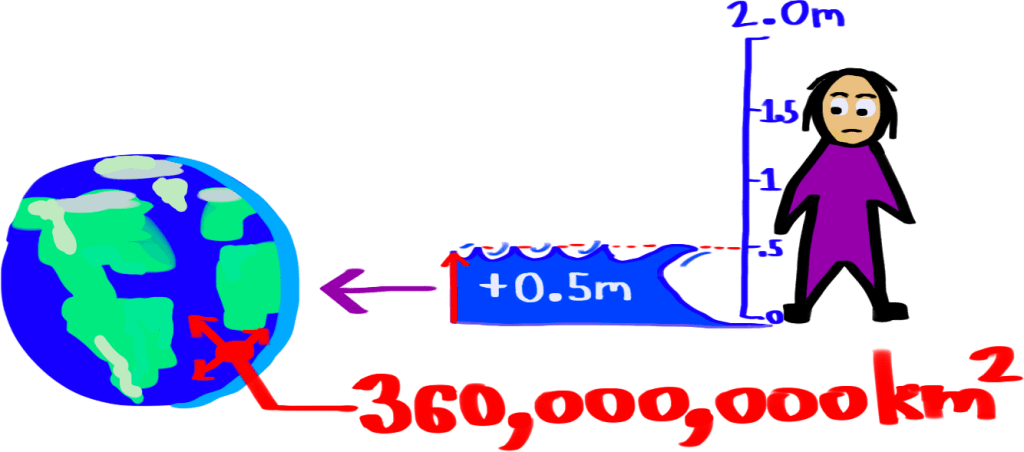 - (360 trillion m2 * 0.5 m sea level rise) = 180 trillion m3
