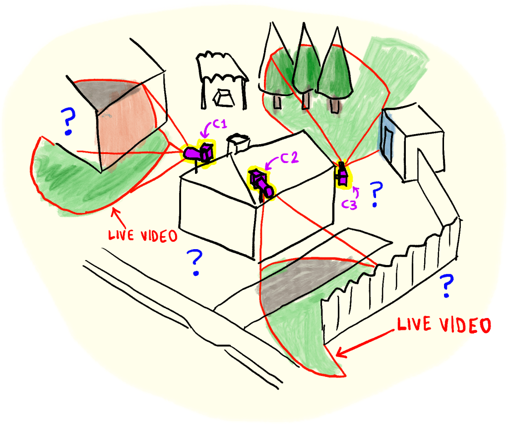 With current camera-viewing technology, the view from these cameras would be three separate rectangular windows. But what if, instead, we synthesize a 3d model out of them, and have the “live 3d view” shown in Figure 2?