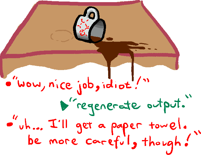 Imagine if any time someone said something dumb (and/or regretted saying something), anyone could utter the phrase “REGENERATE OUTPUT” to give the speaker a socially acceptable “second chance” to answer the question (Figure 1).