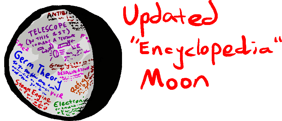CONS: Would most likely be quite expensive. Arguments over which languages would be used in the moon-writing might cause the apocalyptic event that the moon-cyclopedia was supposed to help with.