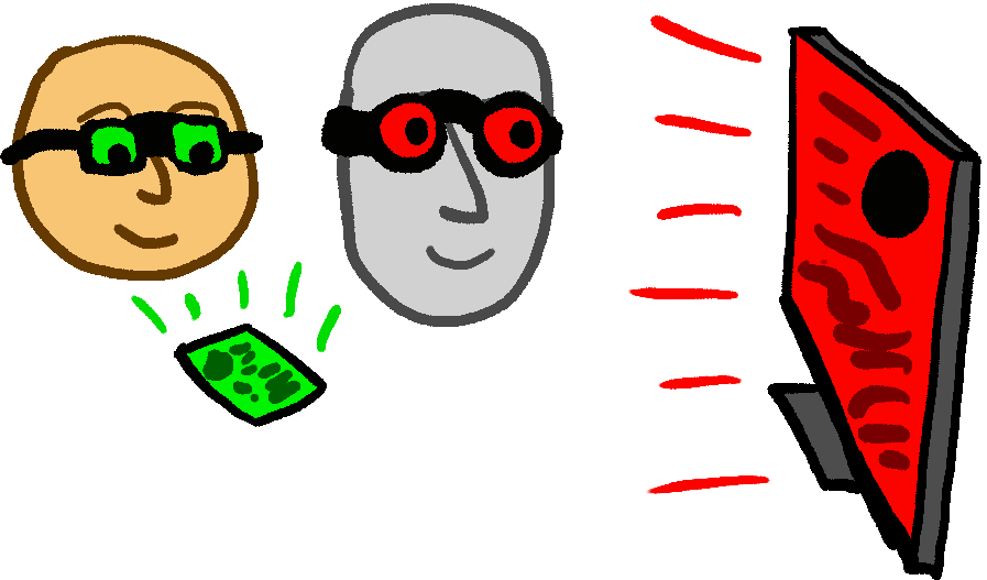 We can use a technique from old red-green 3D movies, which take advantage of the fact that green light won’t go through a red filter, and red light won’t go through a green filter.