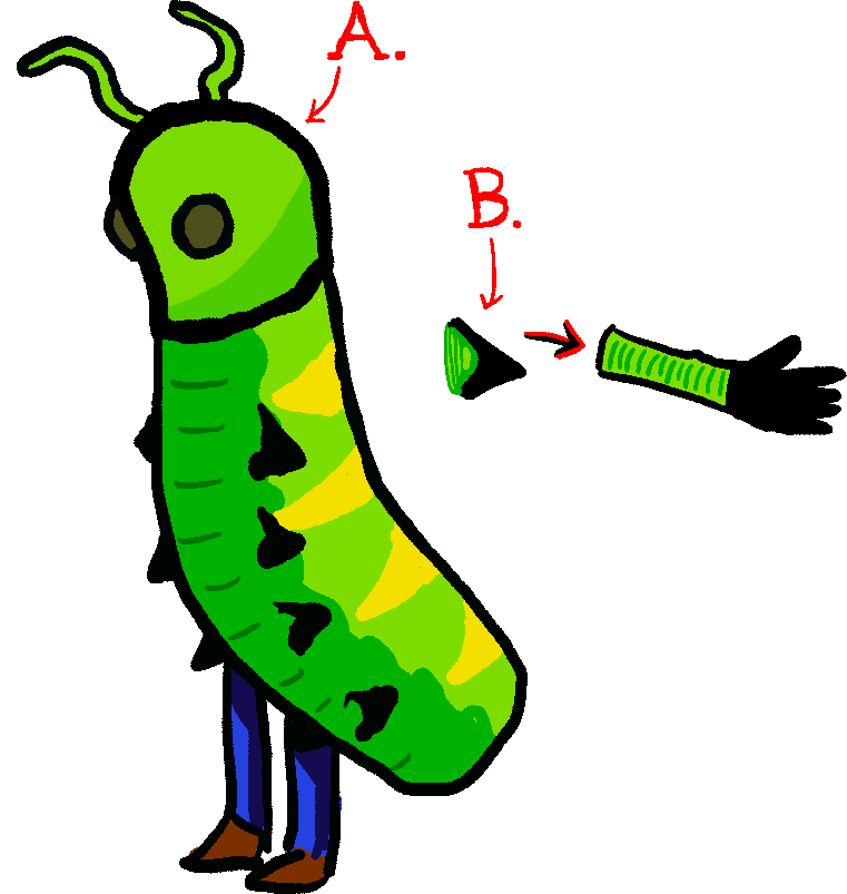 With the hood up (Figure 2a), the caterpillar (or “snake bug,” as sophisticated individuals call it) garment is the perfect clothing choice for a busy individual who doesn’t have time to iron clothes or get a haircut.