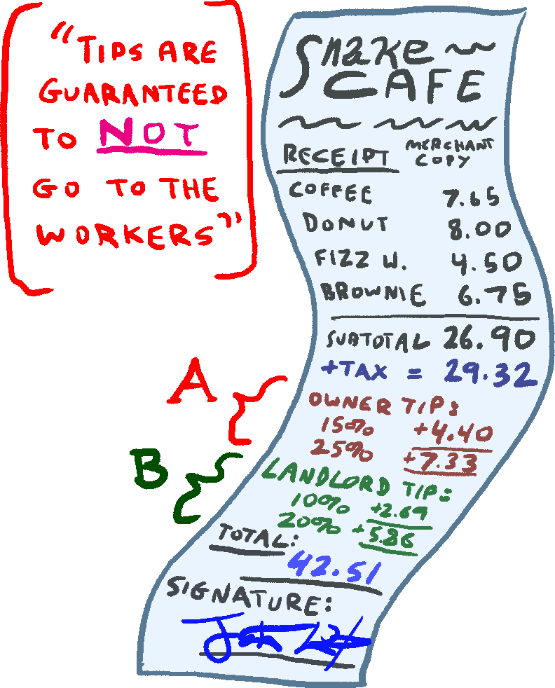 See the receipt mockup in Figure 1 for a cafe that has moved to a “no tipping (of workers)” system. Fortunately, you can still tip the owner (Figure 1 “A” indicator) and landlord (Figure 1 “B” indicator)!