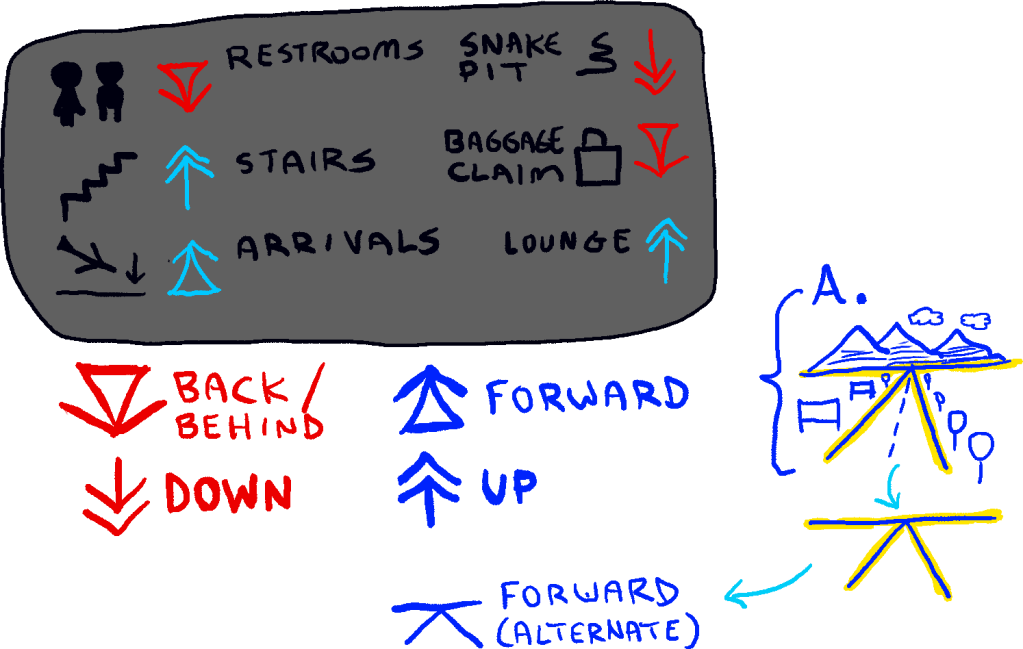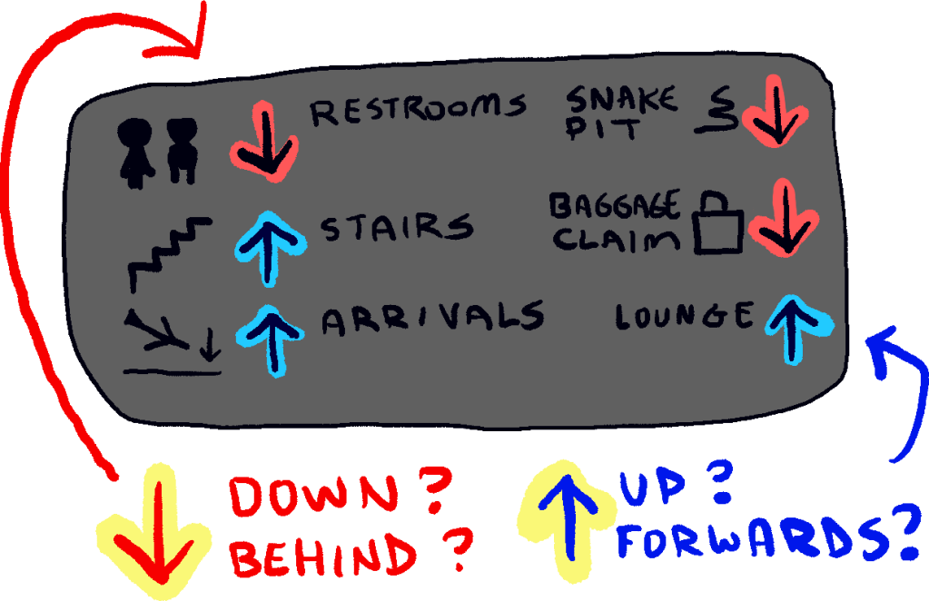 Sometimes, navigation signs need to distinguish between “forward” (usually indicated by a “⇧” symbol) and “up” (on a higher floor). Unfortunately up is frequently represented by the same symbol (Figure 1)!