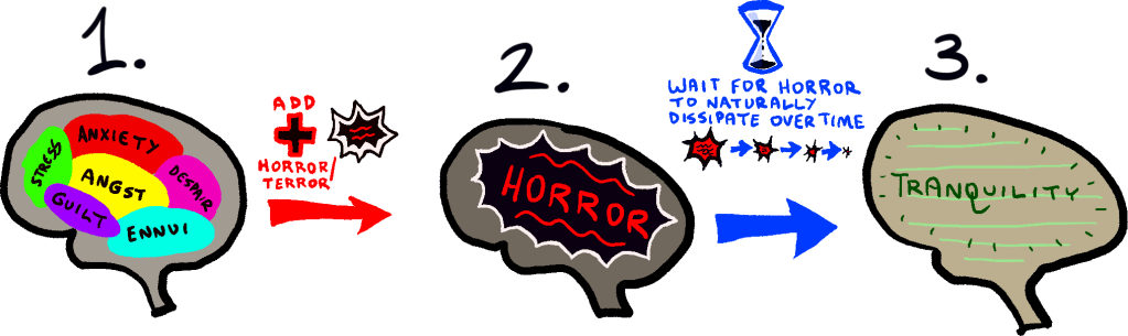 This suggests a possible method of “horror therapy,” by which one temporarily displaces negative feelings by replacing them with a truly horrific scenario as a replacement.