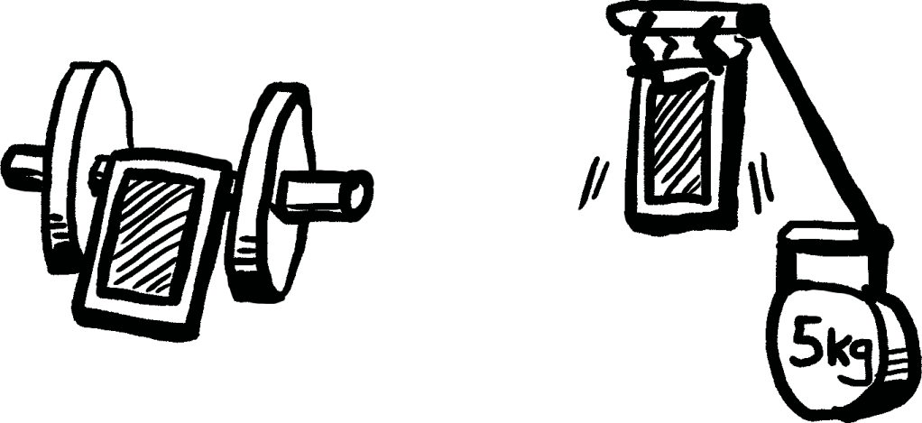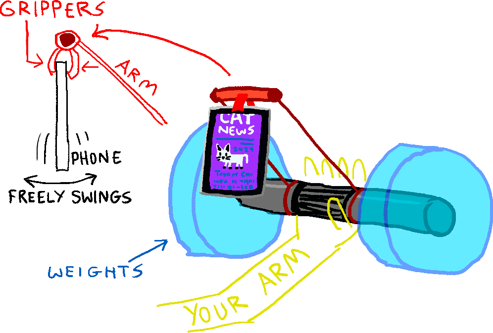 Let’s bring incidental exercise to a common daily activity: doom-scrolling on a phone! Just combine a barbell and a cell phone holder (Figure 1), and you’ve got the perfect encouragement for casual weight lifting.