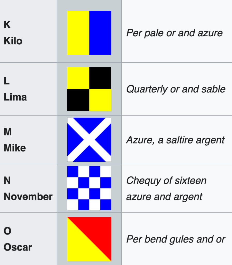 We might initially be tempted to re-use certain national flags, but it turns out that although there are some close matches, there aren’t any exact matches. The Flag of Scotland (🏴) is the best match (to the “M” signal flag: Figure 3), but it’s a different aspect ratio (i.e, it isn’t exactly square).