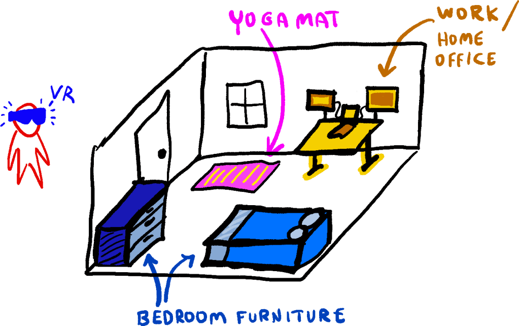 Fortunately, thanks to the power of virtual reality (“VR”), it’s possible to repurpose the same physical space for multiple things while still providing the illusion of a spacious non-cramped home.