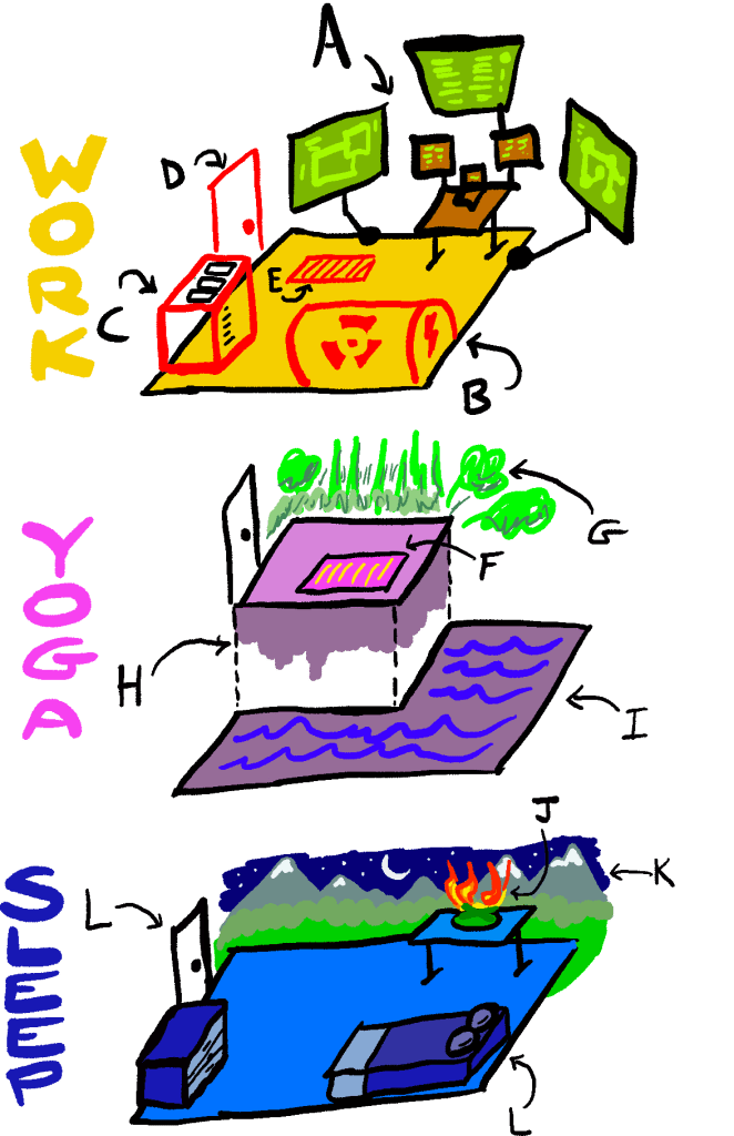 - A “work / home office” space (yellow)