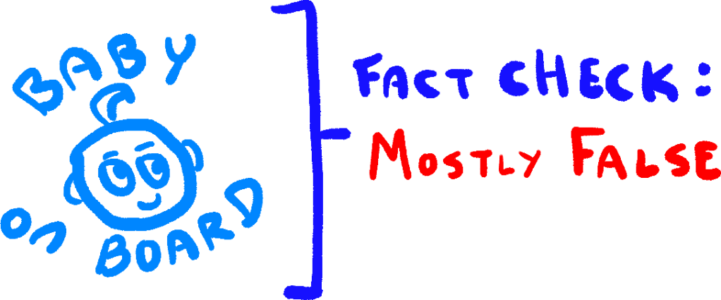 Occasionally, people will apply a sticker to the back of their car that says something to the effect of “Baby on board!” This allegedly has a nebulous beneficial purpose in informing other drivers of the presence of a relatively helpless infant in the vehicle, but it also has a major downside: specifically, it is factually inaccurate most of the time!