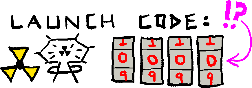 Unfortunately, security around nuclear launches may be inadequate (Figure 1): it was allegedly possible at one point to end the world with just the combination “0000 0000” (https://www.google.com/search?q=icbm+launch+code+00000000).