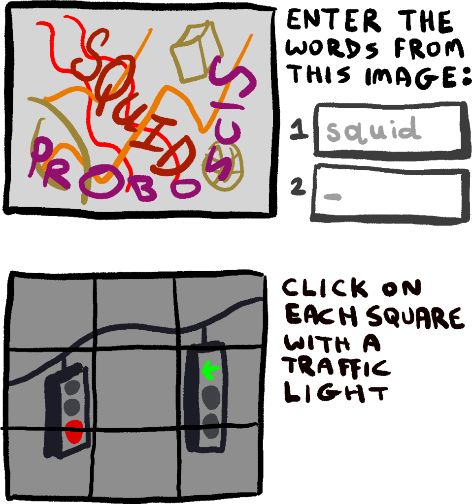 CAPTCHAs were originally somewhat effective at being a “humans only” authorization system. Unfortunately, AI has developed so quickly that CAPTCHAS are much less effective.