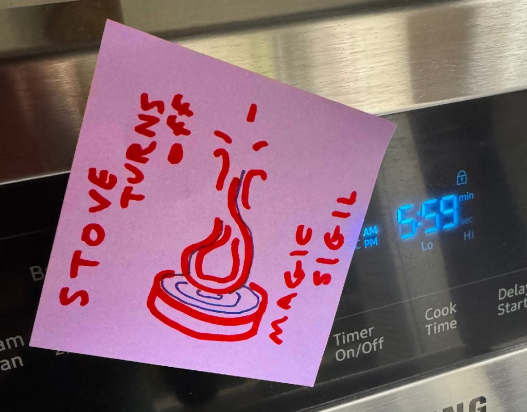 Let’s combine the functionality of a regular reminder (“Remember to turn off the stove after you make ramen!”) with the supernatural force of a magical symbol that will encourage the stove to be turned (Figure 1) off through arcane means unknowable to human beings. You can never be too careful!