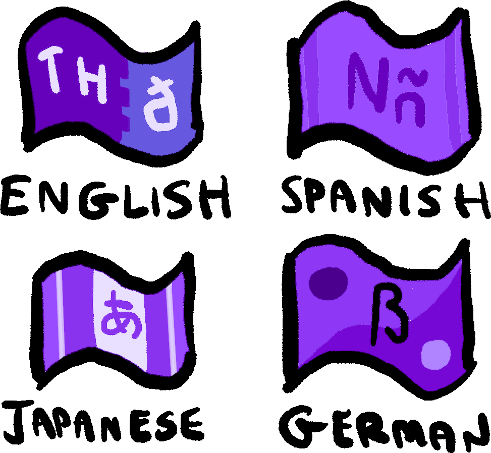 The flags above look like plausible national flags. If we want to make it super obvious that these are language flags, the easiest option might be to take advantage of the fact that purple is rarely seen in national flags.