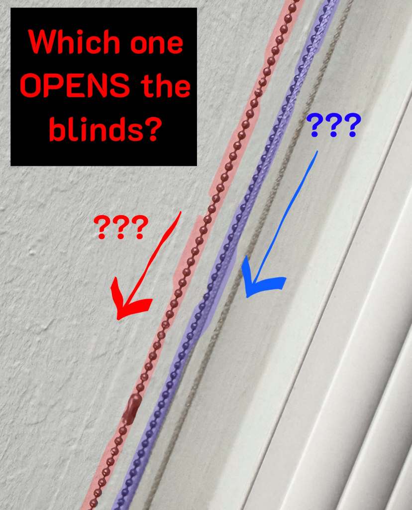Unfortunately, since these cords are both loops, they really appears as TWO cords. The user must somehow know which of these unlabeled-and-often-twisted cords is the correct one to pull (as shown in Figure 1) in order to perform the desired open/close action.