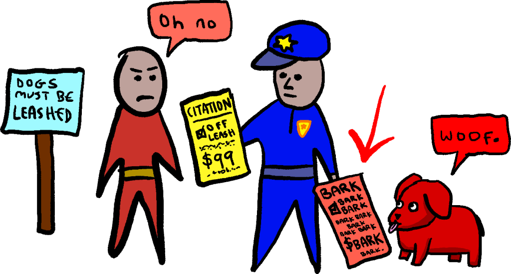 If a person brings a dog to one of these areas and lets it run around off-leash, there’s the possibility that this person will be issued a citation and a small fine (Figure 1).