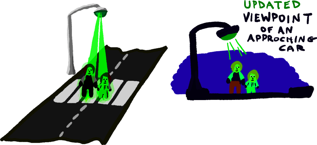 When we think of what this looks like from the perspective of an approaching car, it’s even worse: the pedestrians might not be effectively illuminated at all, and will basically just be indistinguishable silhouettes on a dark background.