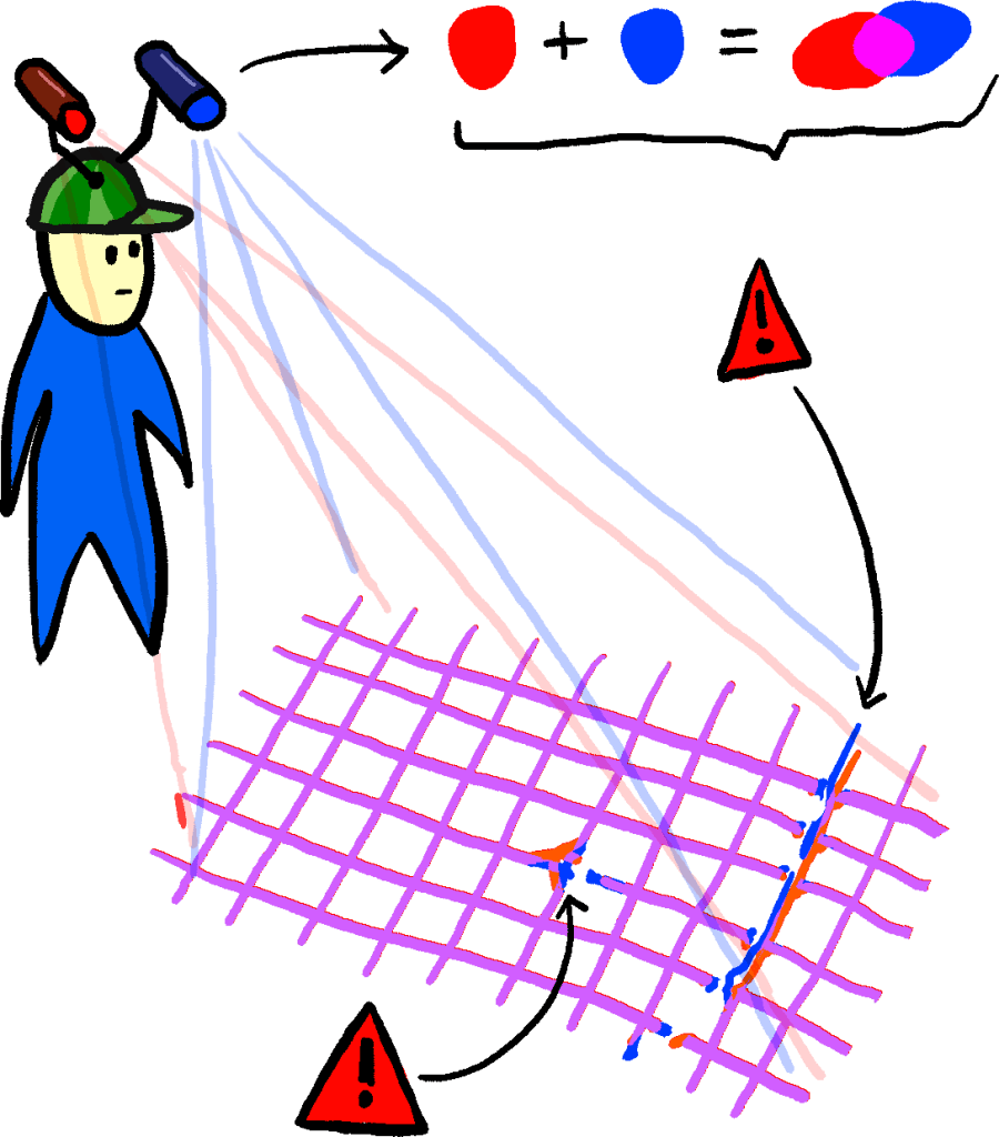 - Second, the use of two projectors means that if the sidewalk is perfectly level, then the lasers will combine to make a single color. But if there is any irregularity, then one or the other laser might be occluded, leading to a different (i.e. non-mixed) color being visible.