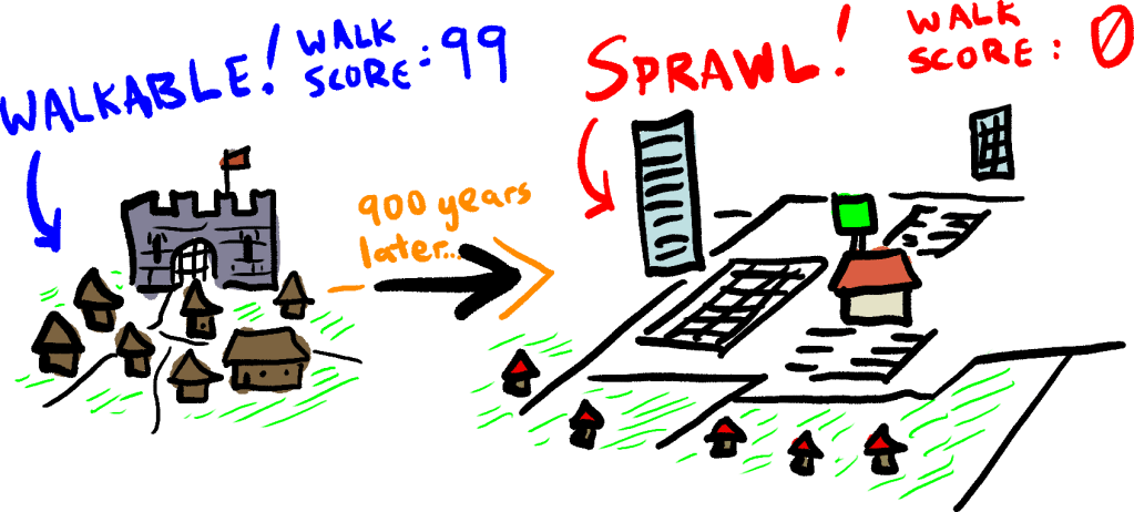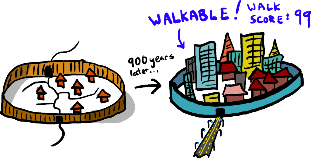 Fortunately, we can bring back walkable cities easily, by just bringing back another feature of settlements of ancient times: the city wall (Figure 2)! Towns and cities could simply decide what a “reasonable” initial size for a city is, wall it off, and prevent development outside of the walls.