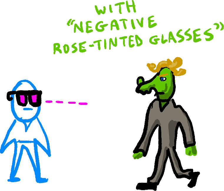 The phrase “seeing things through rose-tinted glasses” refers to the concept of viewing things with artificial optimism. Interestingly, there is no widespread term for the negative version of this concept (i.e., “emerald-tinted glasses” is not a phrase).