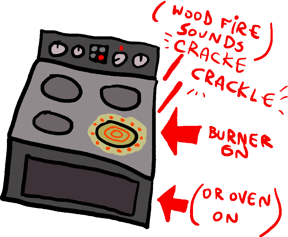 For the oven / stove, we can do the same thing! Just have a speaker on the stove that makes a “crackling fire” sound (Fig. 1) to indicate that the oven / stove is on.