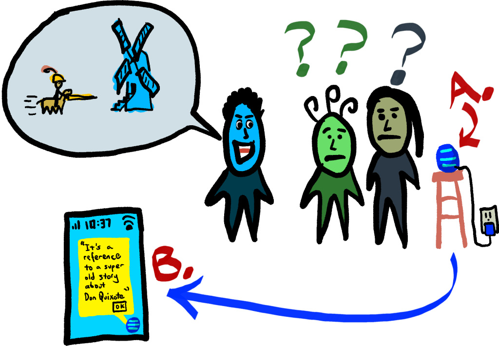 We can make use of the omnipresent microphones in our daily life to listen for cultural references and then, later in the day, send a summary email to each participant of a conversation to annotate any references that the listeners may have missed (Figure 1).