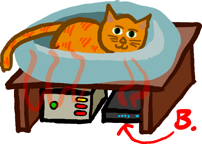 This can be accomplished very easily by placing the heat-generating electronics under a wooden platform with a cat bed on top (Figure 2).